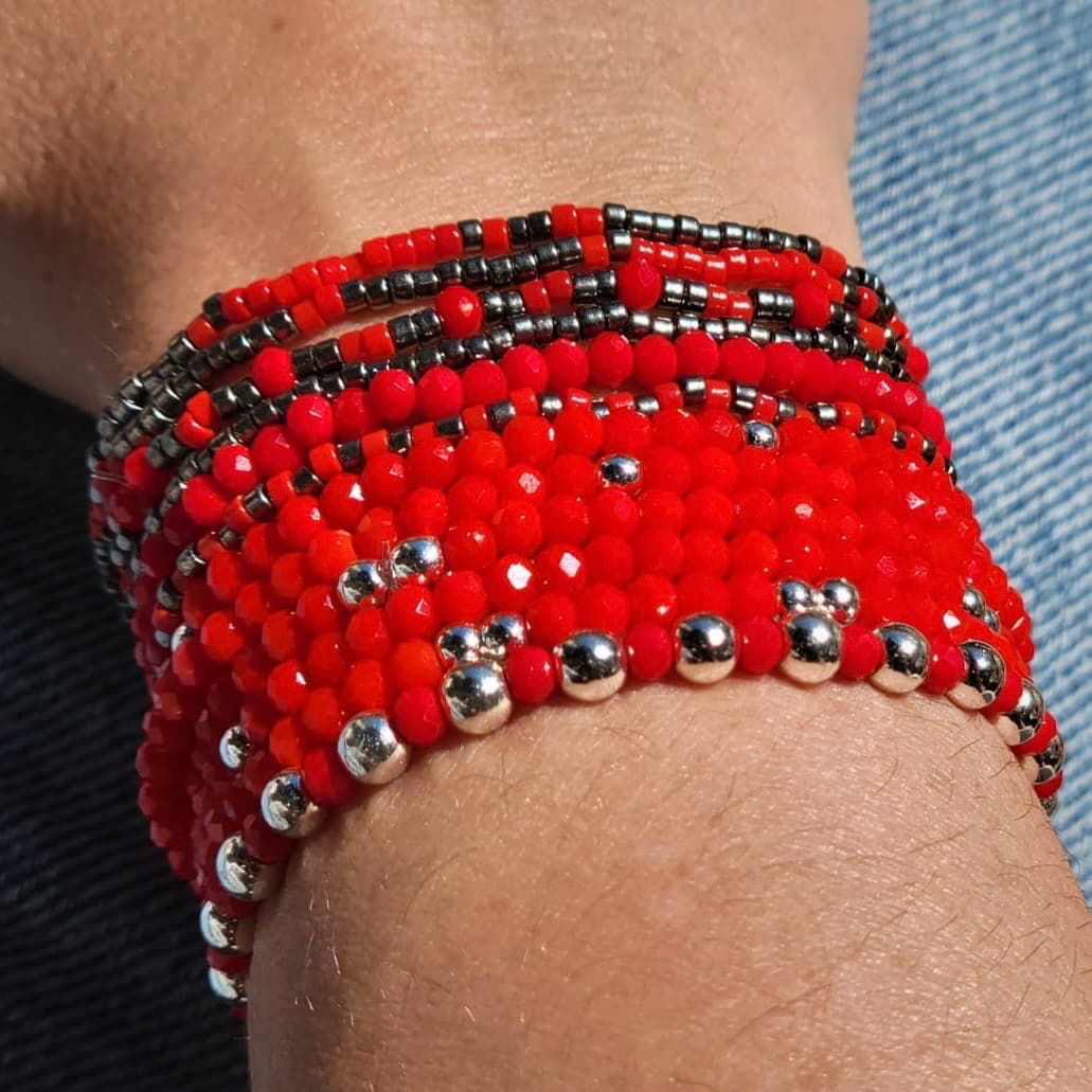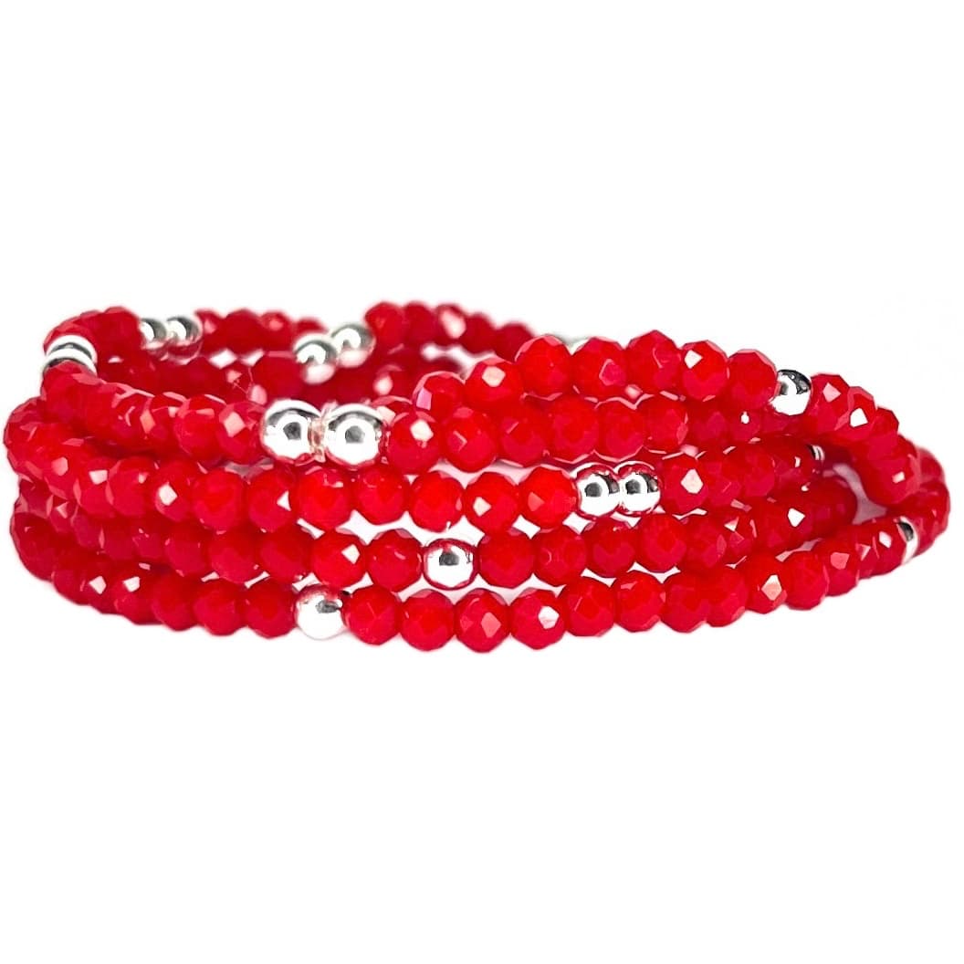 L’éclat et la sophistication de notre bracelet en perles à facettes en verre de cristal cerise et en hématite argentée, conçu pour charmer à chaque tour de poignet.