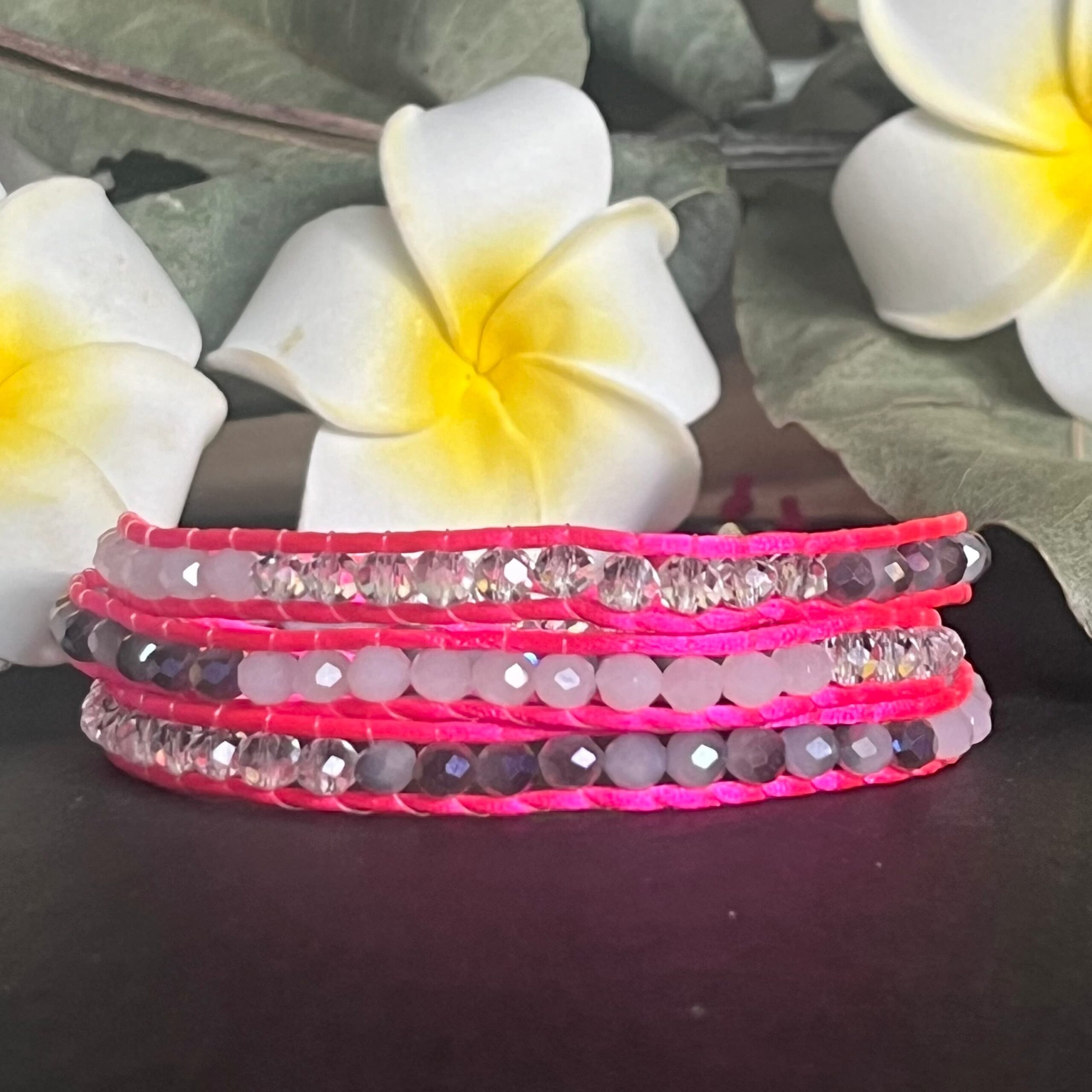 Découvrez la collection emblématique Manchette Honolulu 3 Tours, une gamme de bracelets qui capture l’essence vibrante de l’été avec une touche de sophistication. Ces manchettes en cordon, ornées de perles à facettes délicatement dégradées en blanc, sont disponibles dans une palette de couleurs néon éclatantes : néon jaune, néon rose, néon vert et néon bleu.
