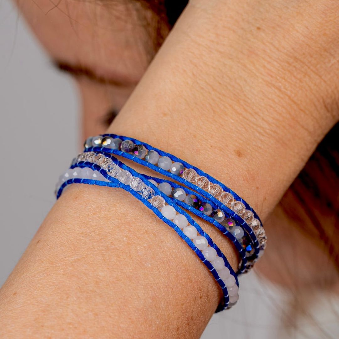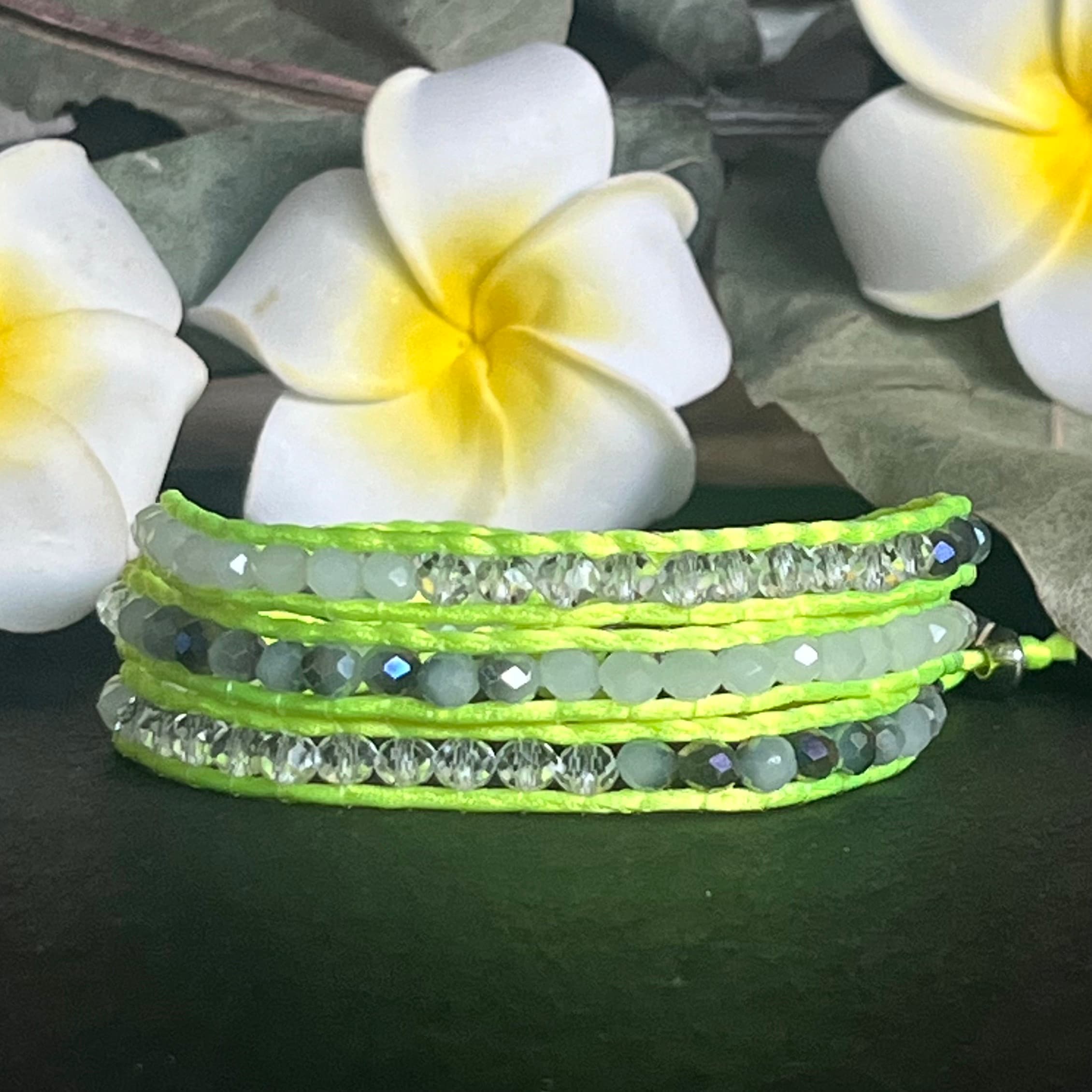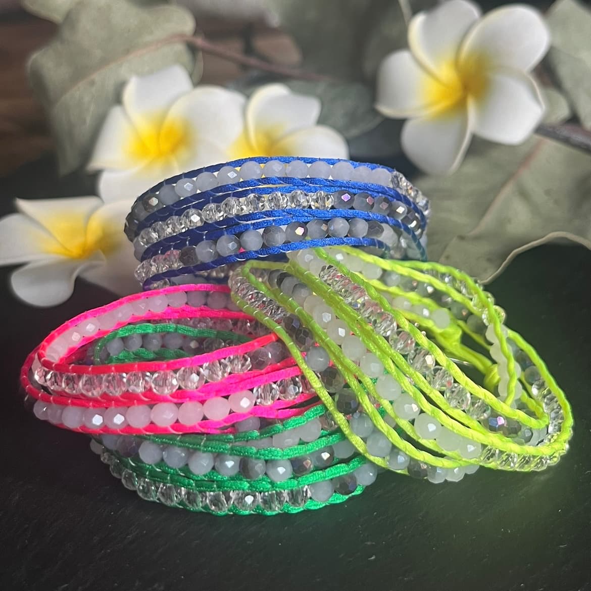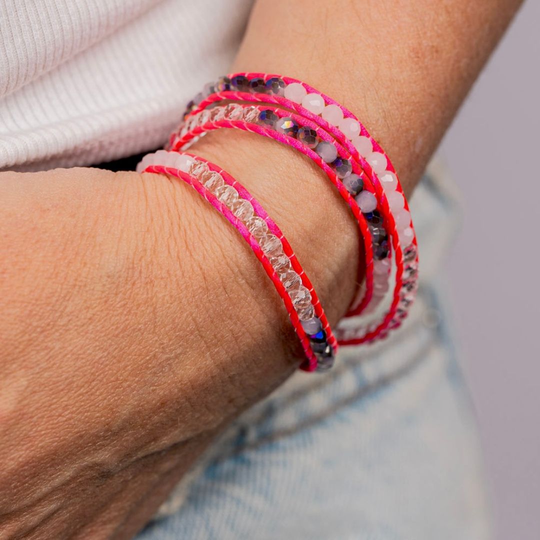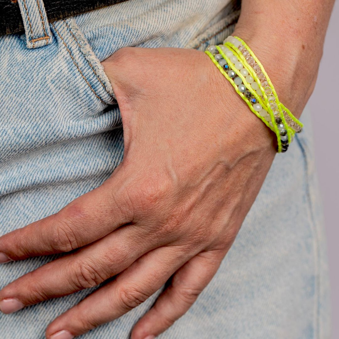 Chaque bracelet est conçu pour s’ajuster parfaitement à votre poignet grâce à un fermoir bouton en acier inoxydable, garantissant à la fois confort et sécurité. Les trois tours de cordon, agrémentés de perles lumineuses, créent un look multicouche élégant et moderne, parfait pour ajouter une touche de couleur et de dynamisme à n’importe quelle tenue estivale.