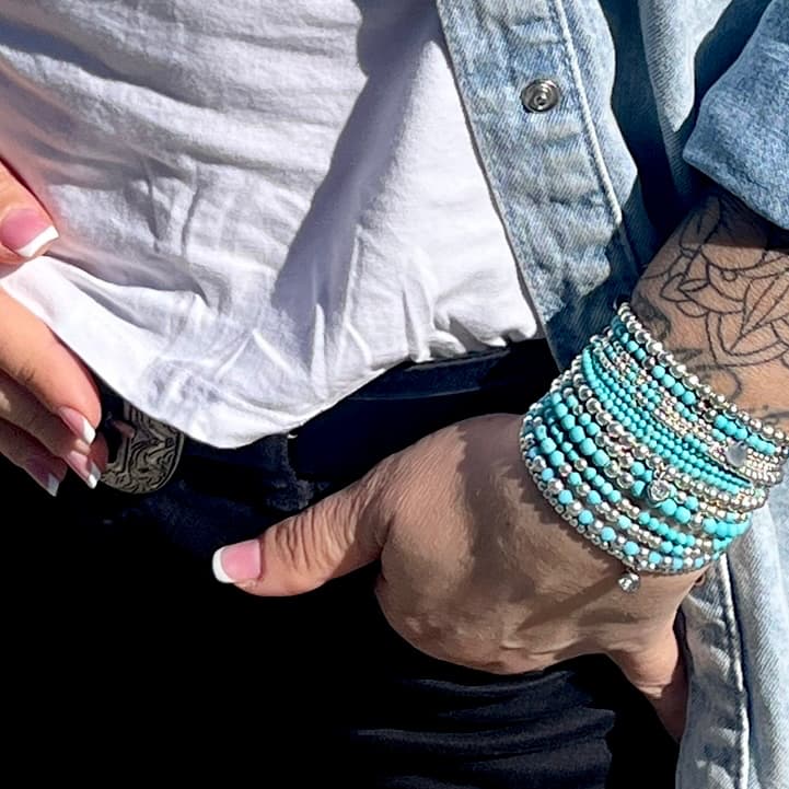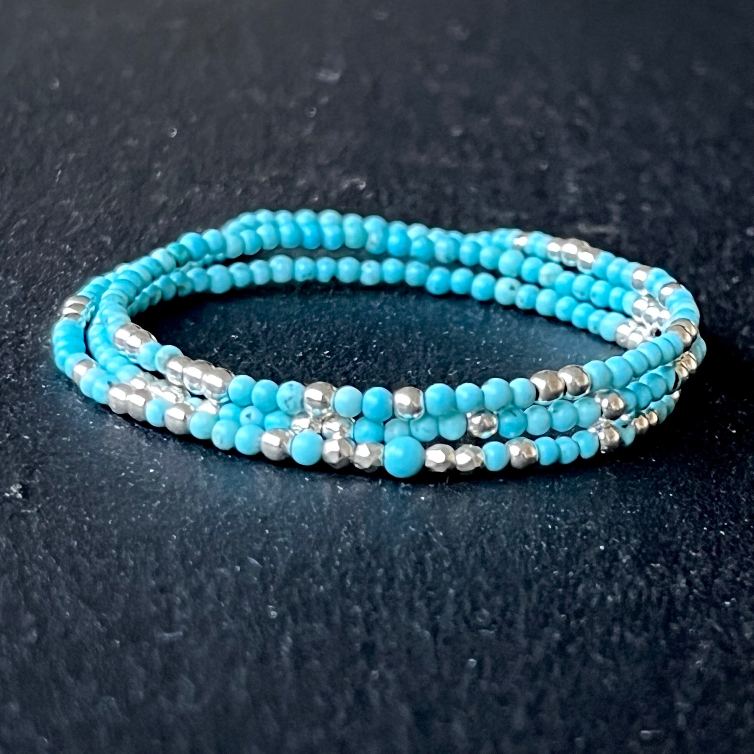 Cette magnifique et chic manchette en pierre turquoise et hématite s’enroule autour de votre poignet en trois tours, créant une esthétique unique et un charme irrésistible. Les perles de turquoises et hématite lisses et polies reflètent la lumière d’une manière hypnotique, captivant tous les regards.